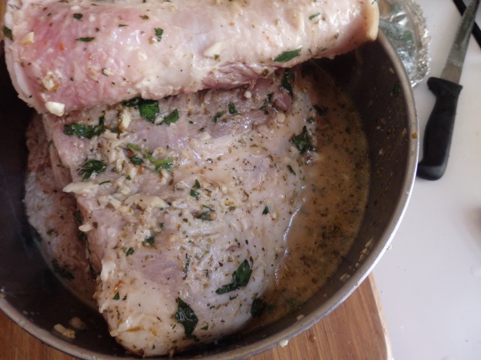 3. Place pernil in roasting pan skin side up. Rub the marinade all over the pernil, making sure you pour a little of it into to the holes. You can stick extra garlic in here, too. Return the skin back to its original position. Score the skin with diagonal cuts and sprinkle salt to taste over the skin.